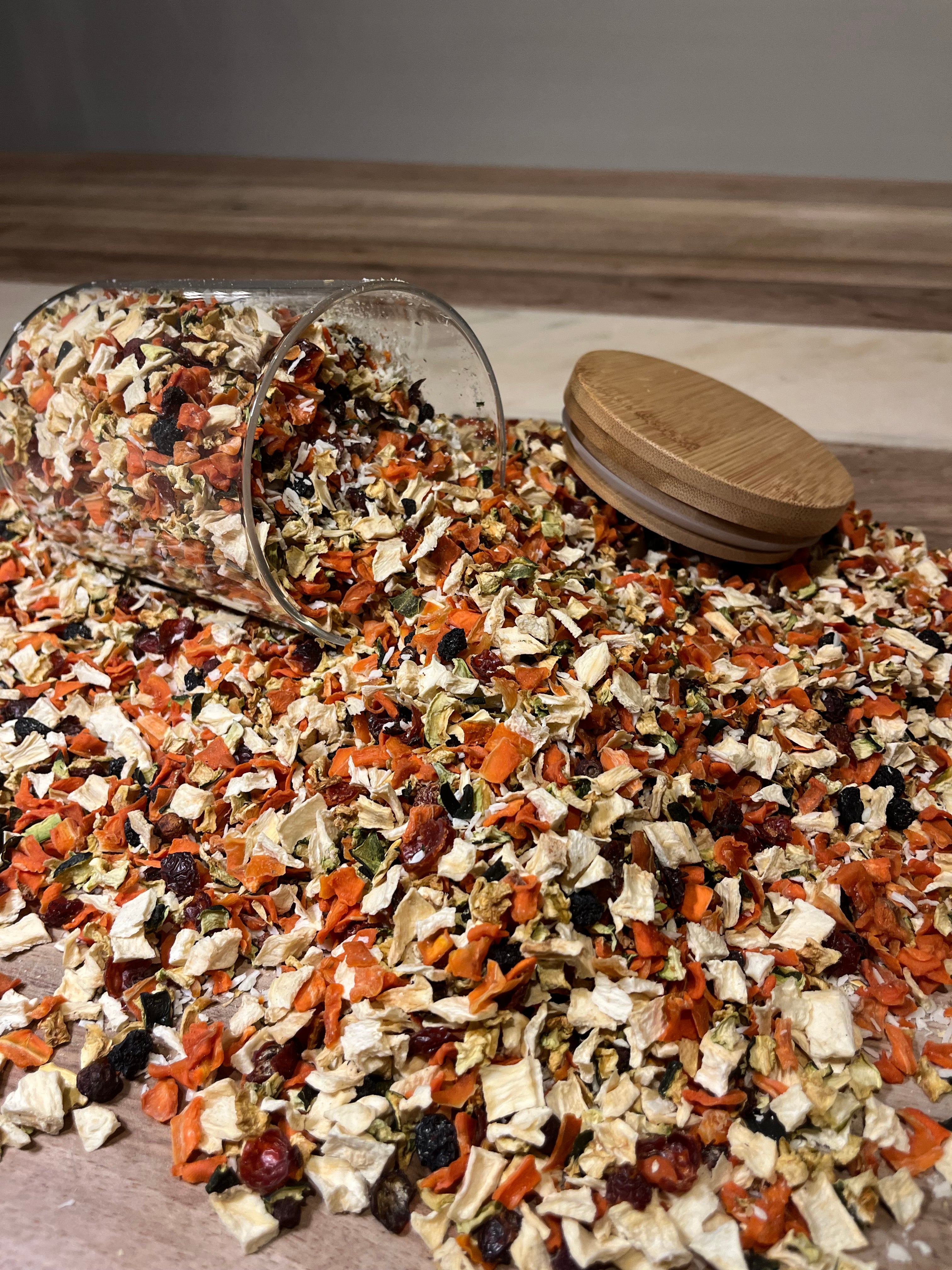 Die Flocken bestehen zu 100 % aus Bio-Gemüse (Karotten 38 %, Kokos 30 %, Pastinaken 14 %, Zucchini 10 %, Hagebuttenschalen 4 %, Aroniabeeren 2 %, Weißdornbeeren 2 %).